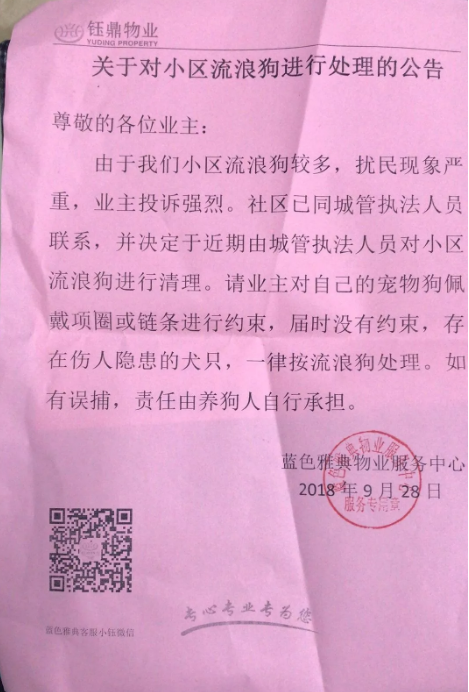 “我们从今天开始,通过微信、单元楼门口张贴公告等方式,广泛宣传此次流浪狗处理的相关情况。针对养狗业主,还将上门一对一开展宣传,让广大业主主动给自家的爱犬佩戴项圈。”张经理说,经过前期宣传、动员后,将明确由业主自行给爱犬佩戴项圈的最后期限,目前暂定为“十一”小长假的最后一天。之后将组织人员对小区内流浪狗进行抓捕。