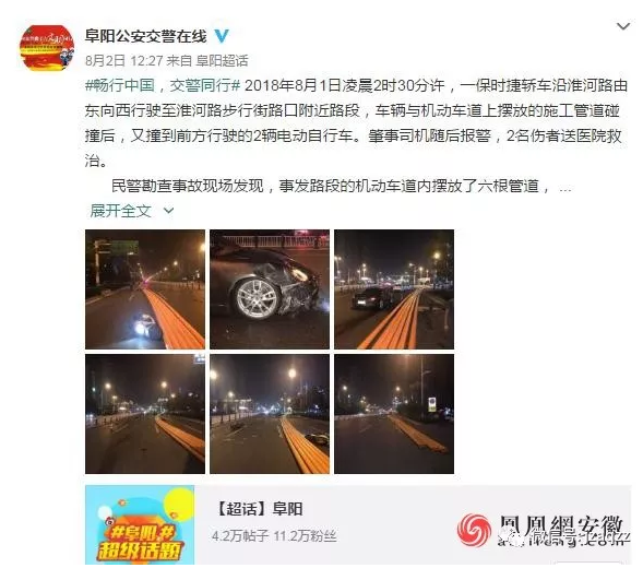 据“阜阳公安交警在线”微博消息称,2018年8月1日凌晨2时30分许,一保时捷轿车沿淮河路由东向西行驶至淮河路步行街路口附近路段,车辆与机动车道上摆放的施工管道碰撞后,又撞到前方行驶的2辆电动自行车。肇事司机随后报警,2名伤者送医院救治。