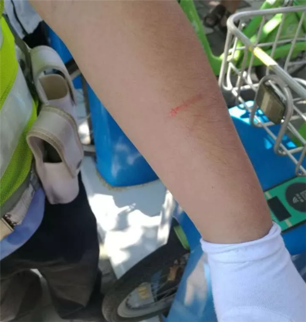 在查纠一起电动车违法安装遮阳篷时,民警告知将予以拆除,骑车女子拒不配合,辱骂并对民警拳打脚踢,执勤民警手臂被抓伤。